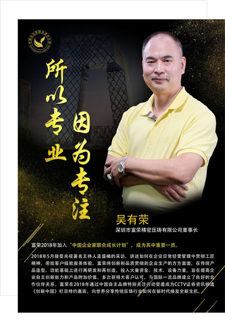 快盈500个人主页2018年5月,敝人接受了央视著名主持人孟盛楠的采访,在采访中,敝人分享了如何在企业日常经营管理中贯彻工匠精神,带给客户极致服务体验的经营技巧。在企业发展中,将创新和品质贯彻到企业生产每一个层面,在传统产品造型及功能基础上进行再研发与再创造,投入大量资金、技术、设备力量,这些旨在提高企业自主创新能力和产品的附加价值。此措举多次获得了广大客户朋友的认可,并在合作过程中与国际一流品牌建立了良好的伙伴关系。敝人感到非常荣幸公司能在2018年通过中国自主品牌特别关注行动并受邀成为CCTV证券资讯频道《创新中国》栏目的特约嘉宾,才能有机会与广大朋友分享传统压铸如何在新时代焕发全新生机与力量。